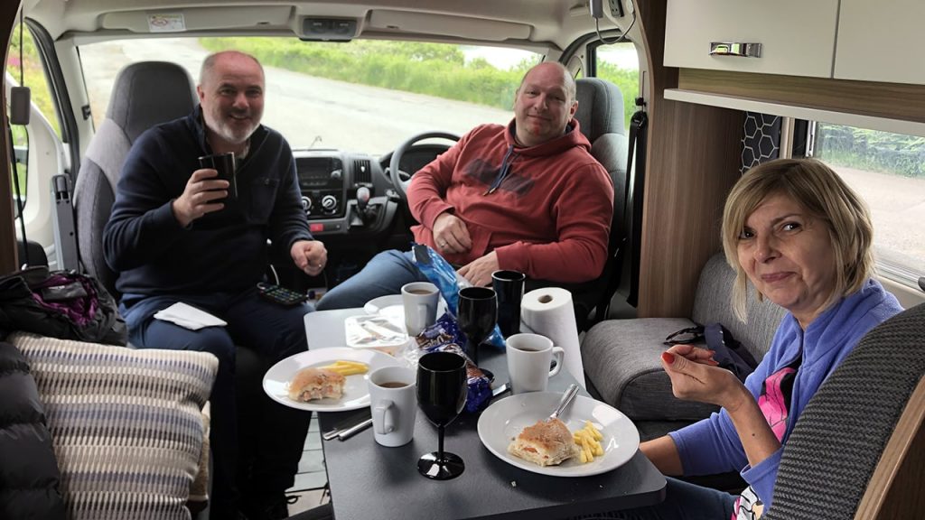 Some little time later and once back at the campsite, we gathered for a leisurely cuppa and breakfast in Pete and Fi’s van. This was the larger of the two vans and was always the more organised in the morning as they didn’t need to put the bed away. (With the larger van you got a proper bed tucked away in the back of the van).