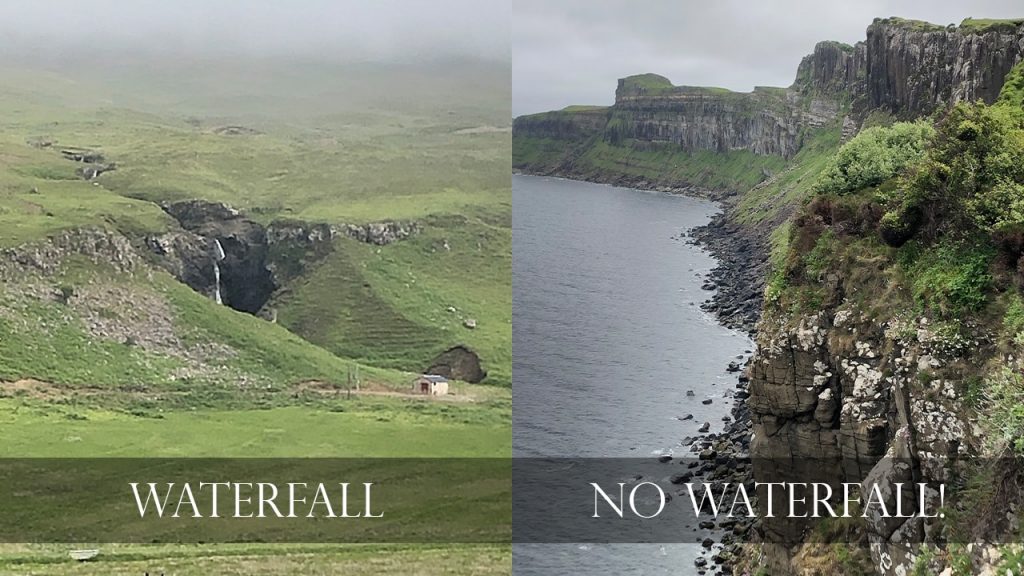 We were heading to Kilt Rock to admire a massive waterfall. The pictures showed it majestically flowing over the rather dramatic cliff edge and dropping down into the sea…