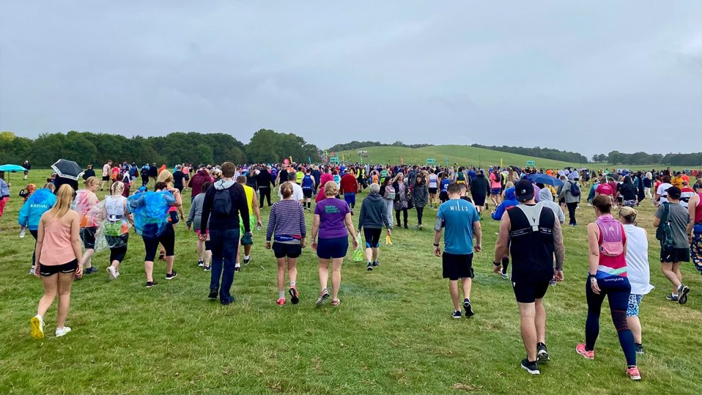 As we got closer we saw we’d be channelled in sections up a steep grass banking (just what you need a steep hill on potholed grass before a big run!) …this would take us down onto the motorway and along to the usual start place of the race.